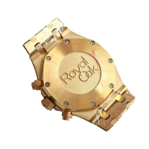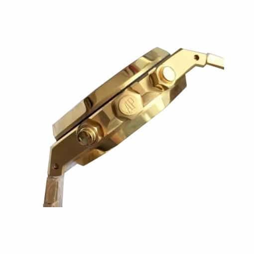 The Royal Oak AP Replica is a striking watch from Audemars Piguet’s Royal Oak Chronogaph family. It features a 2236 Automatic movement with a 60-hour power reserve and precision within COSC certification limits. The case is made of 904L stainless steel with a yellow gold color. and the bezel is also made of 904L stainless steel with a matching yellow gold color. The crystal is sapphire and the size is 41.00 mm with a thickness of 15.00 mm. The bracelet is also 904L stainless steel with a Royal Oak design and adjustable links. The dial is black with stick and dot indices. and the hour markers and hands are made of 904L stainless steel.