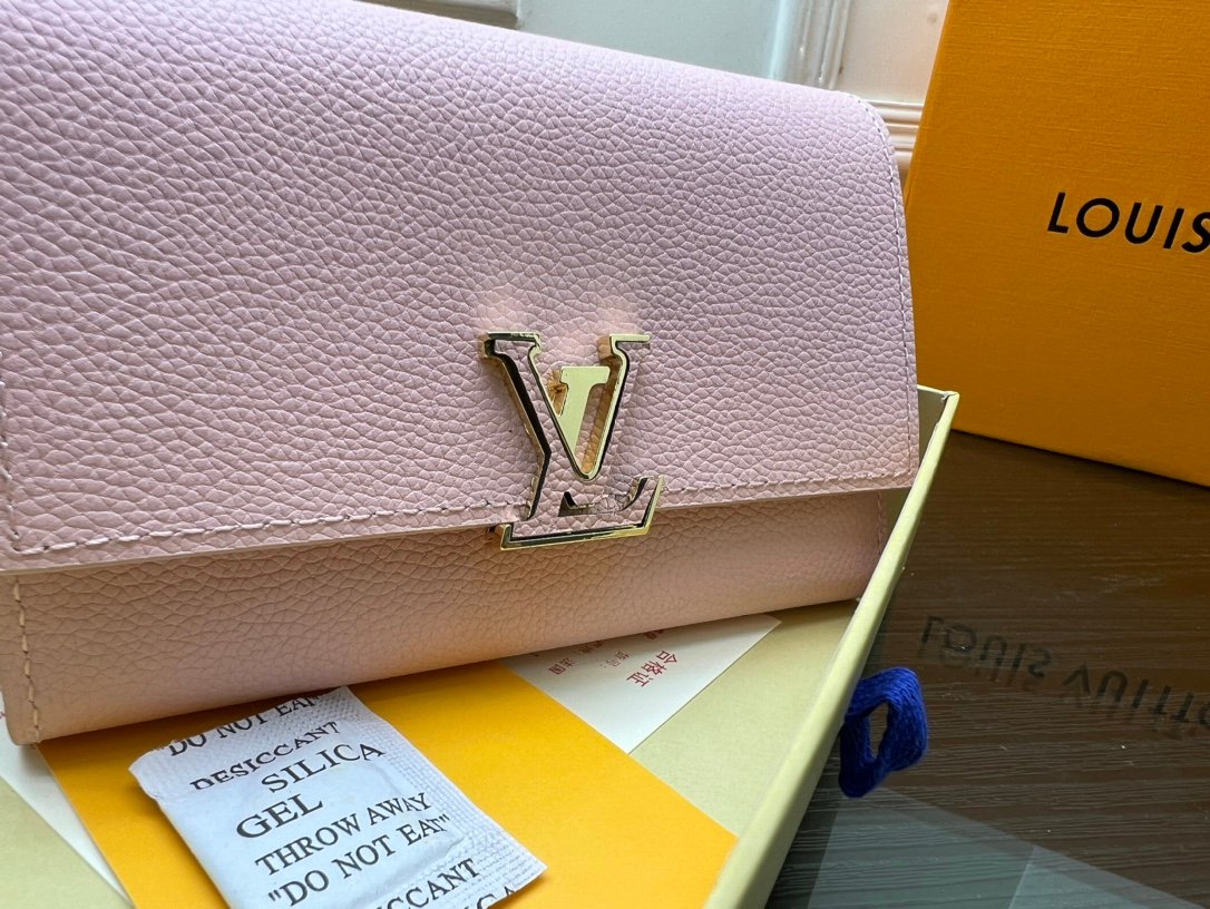 M62157 is crafted in Taurillon leather, and this Capucines mini purse is versatile and spacious to accommodate everyday belongings. The elegant bag wallet’s construction is ingeniously original and consists of two folding vertical lids, providing plenty of room for credit cards, change and banknotes. Size: 13.5 * 9.5 * 1.5cm