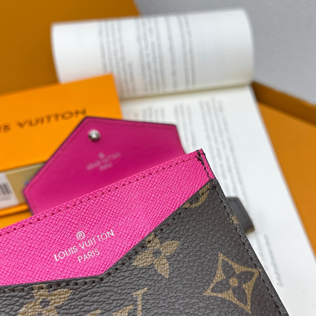 M12884 This card holder renews the envelope-style configuration of the original Kirigami Pochette Ms clutch bag, adding a new idea to the Colormania collection. The Monogram canvas combines a bright leather lining and a glossy snap-on, and the 2-in-1 compartment can be removed for use alone.