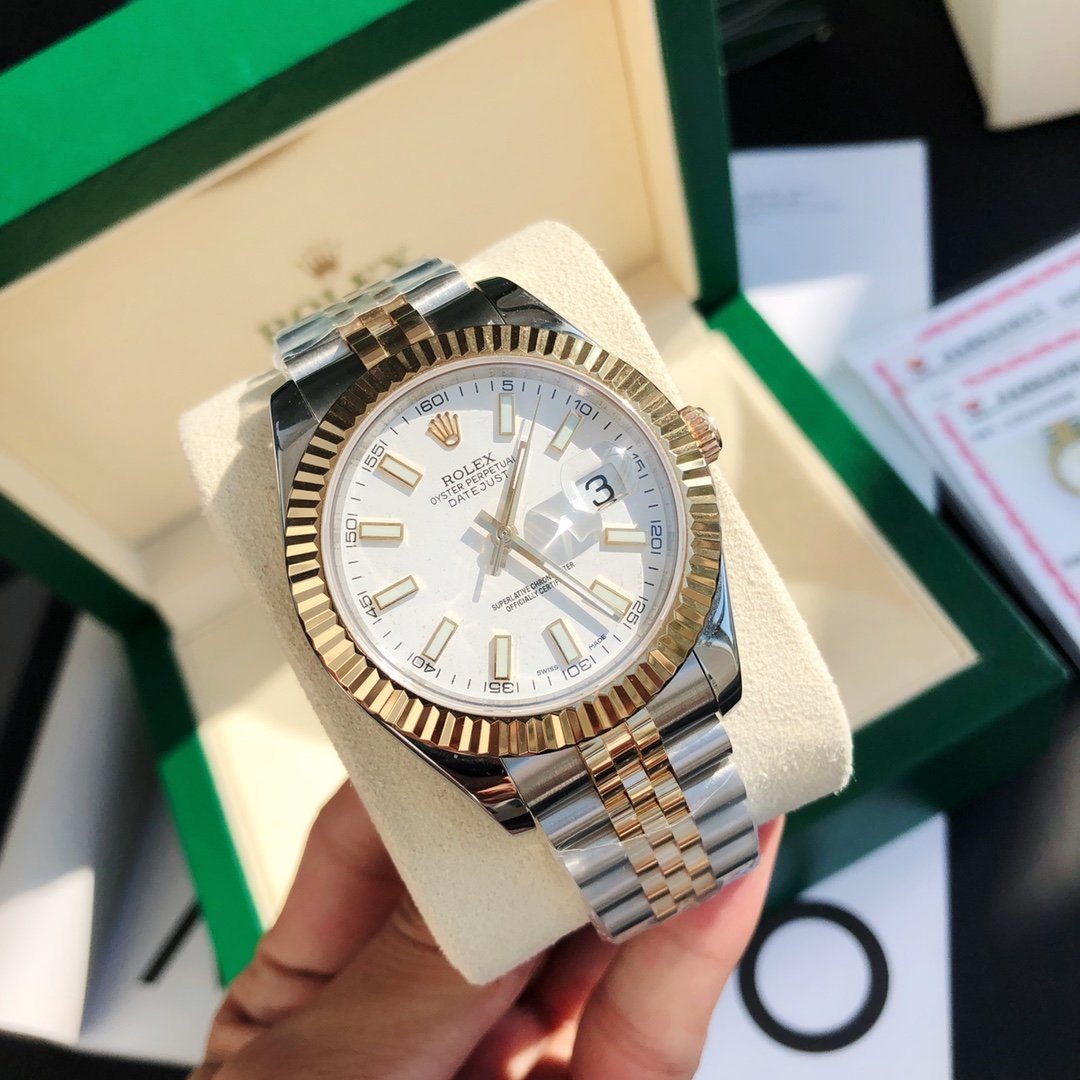 This is a gold replica watch from the Rolex Datejust 41 collection. It is powered by the 3235 self-winding movement, offering a power reserve of 60 hours. Certified by the Swiss Official Chronometer Testing Institute (COSC), it maintains a daily accuracy of -3/+3 seconds. The case is crafted from 904L stainless steel with a diameter of 41mm. The bezel, also made of 904L stainless steel, is plated with gold. The crystal is sapphire glass, and the bracelet features a five-link 904L stainless steel design with adjustable links. The white dial features 904L stainless steel baton hour markers and hands. The watch displays hours, minutes, seconds, and date, and is certified by the Swiss Official Chronometer Testing Institute (COSC). Water-resistant to 30 meters, its serial number, case number, font, strokes, and markings are identical to the genuine article. Additionally, it comes with a two-year international warranty.